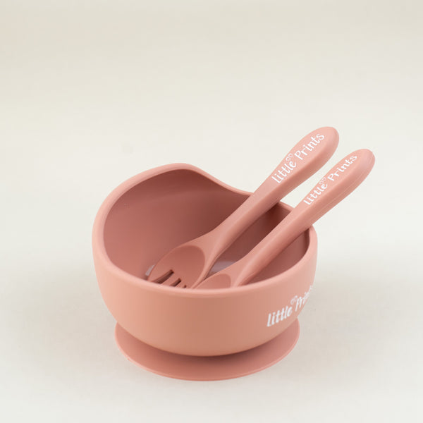 Set diversificare bol + lingurita & furculita silicon cu ventuza anti-alunecare Little Prints Moon - Rose Dawn