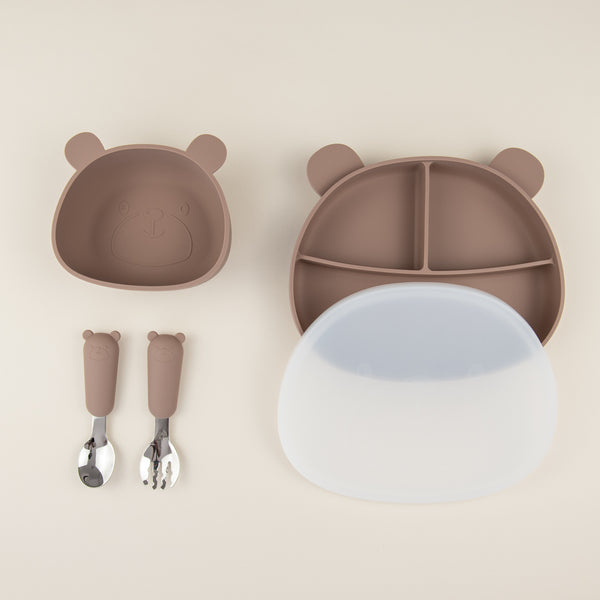 Set diversificare bebelusi din silicon (bol cu ventuza + farfurie cu capac si ventuza anti-alunecare + tacamuri) - Bear Brown