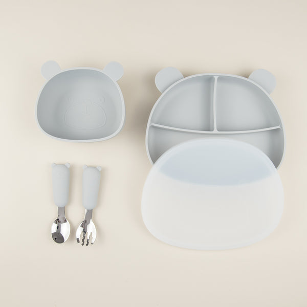 Set diversificare bebelusi din silicon (bol cu ventuza + farfurie cu capac si ventuza anti-alunecare + tacamuri) - Bear Cloud