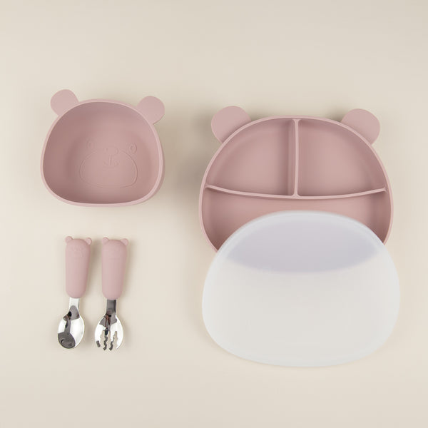 Set diversificare bebelusi din silicon (bol cu ventuza + farfurie cu capac si ventuza anti-alunecare + tacamuri) - Bear Pink Plum
