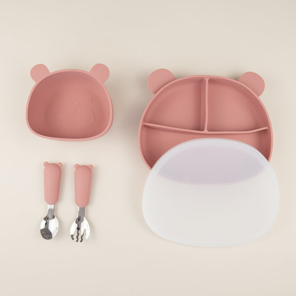 Set diversificare bebelusi din silicon (bol cu ventuza + farfurie cu capac si ventuza anti-alunecare + tacamuri) - Bear Rosedawn