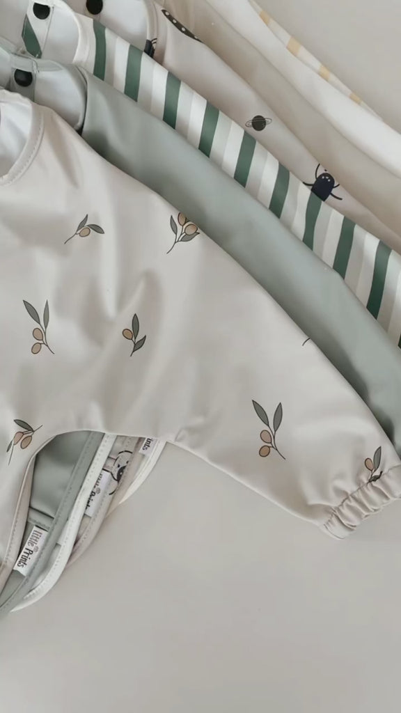 Bavetele cu maneci lungi Little Prints sunt articole esentiale in perioada de diversificare, fiind practice si usor de curatat, salvand multe haine patate si timp pentru curațare. Bavetele sunt potrivite pentru varsta de la 5 luni pana la 2 ani. Inchiderea bavetei este cu capse in partea din spate. Acestea sunt de asemenea waterproof fiind usor de folosit si de curatat. Buzunarul bavetelor este util pentru a capta scurgerile de mancare din timpul mesei.
