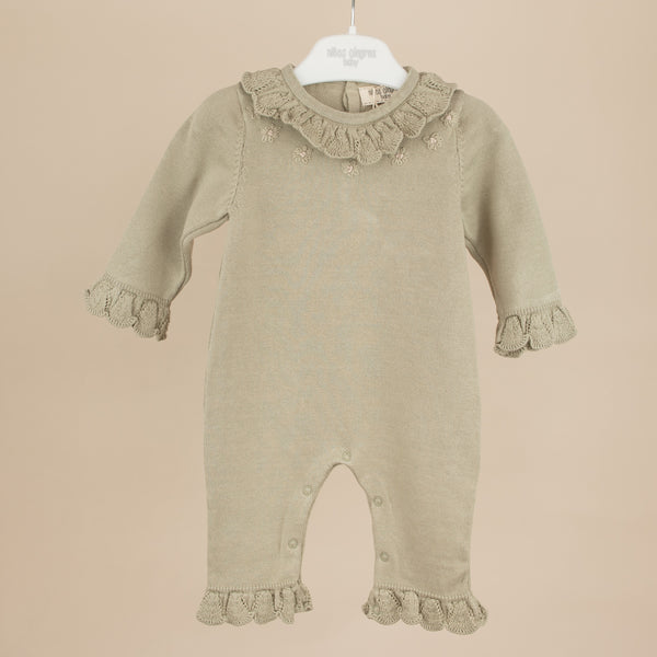 Salopeta tricotata din bumbac cu volanase pentru bebelusi - Sage