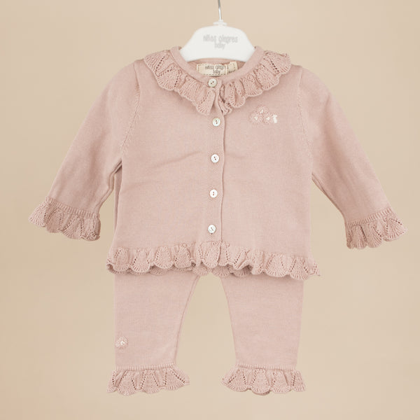 Set 2 piese tricotate cu volanase din bumbac pentru bebelusi, cardigan și pantaloni - Lady