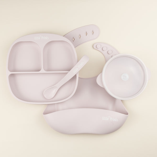 Set Soft Lavender - baveta silicon Soft Lavender / farfurie silicon divizata cu ventuza anti-alunecare Soft Lavender / bol din silicon cu capac si ventuza anti-alunecare Soft Lavender / lingurita silicon Soft Lavender