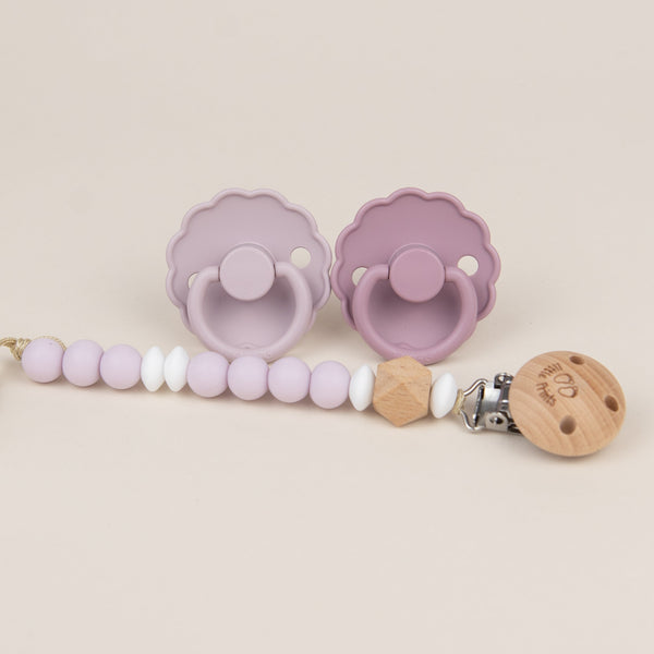 Set Clip Lantisor + 2 Suzete FRIGG Daisy cu tetina rotunda - Selly Lilac