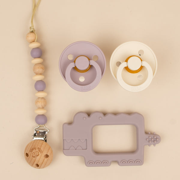 Setul conține: 2 suzete Bibs Colour (Dusty Lilac + Ivory) + clip lănțișor suzetă Edis Lilac + jucarie dentitie din silicon Crocodile Lilac.