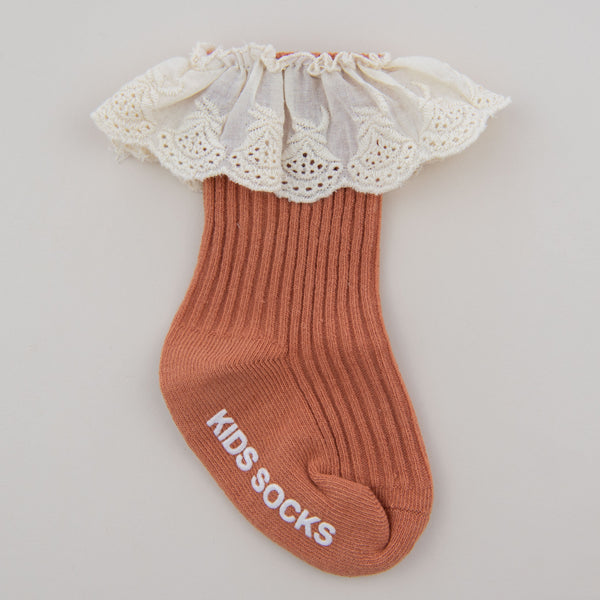 Sosete lungi antiderapante bebe cu dantela brodata - Terracotta